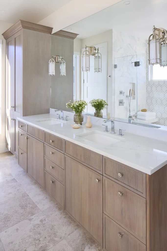For a warmer feel, natural wood vanities in white oak or walnut bring organic texture and timeless elegance. Pair rich wood tones with marble countertops and brushed brass hardware for a layered, sophisticated result.