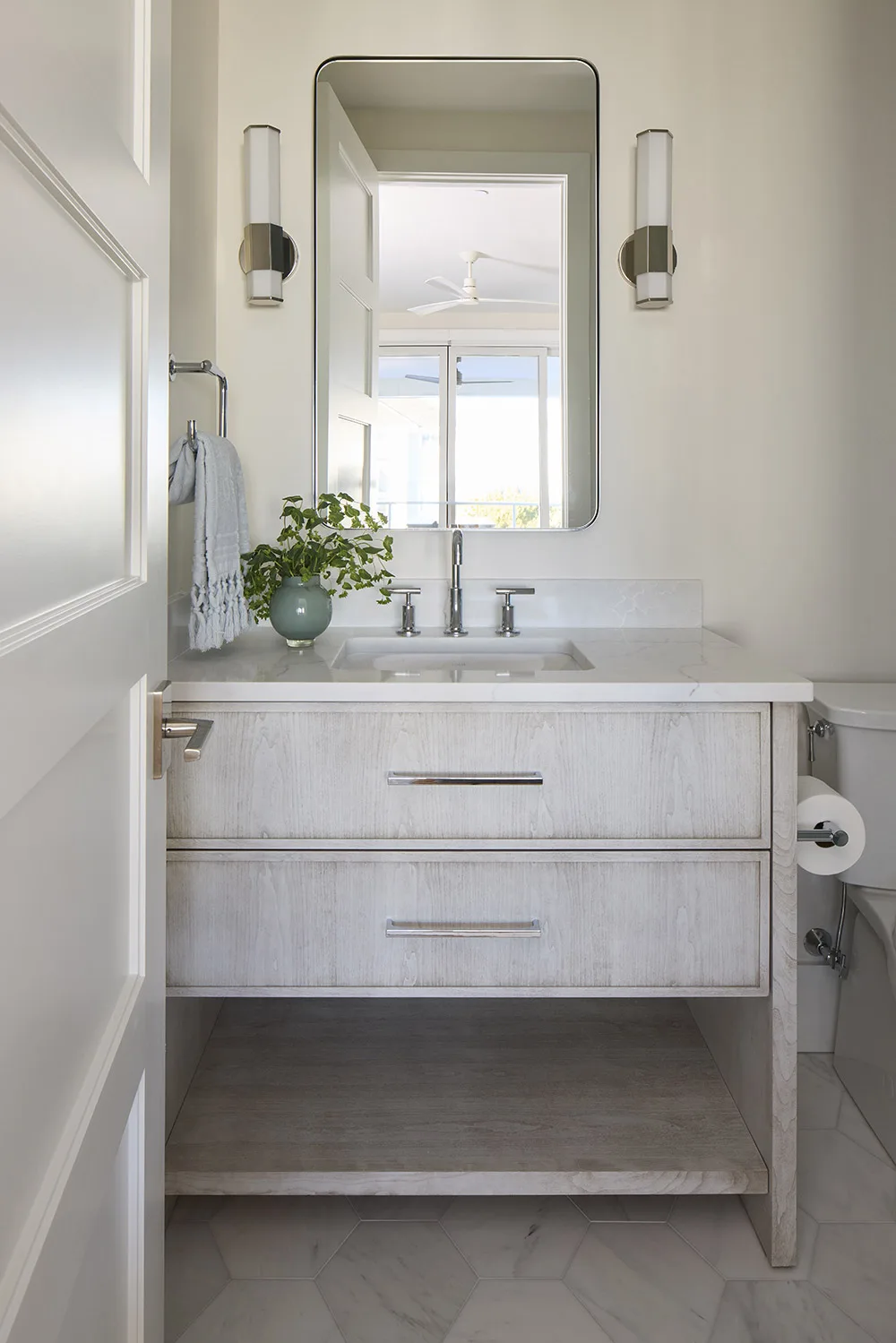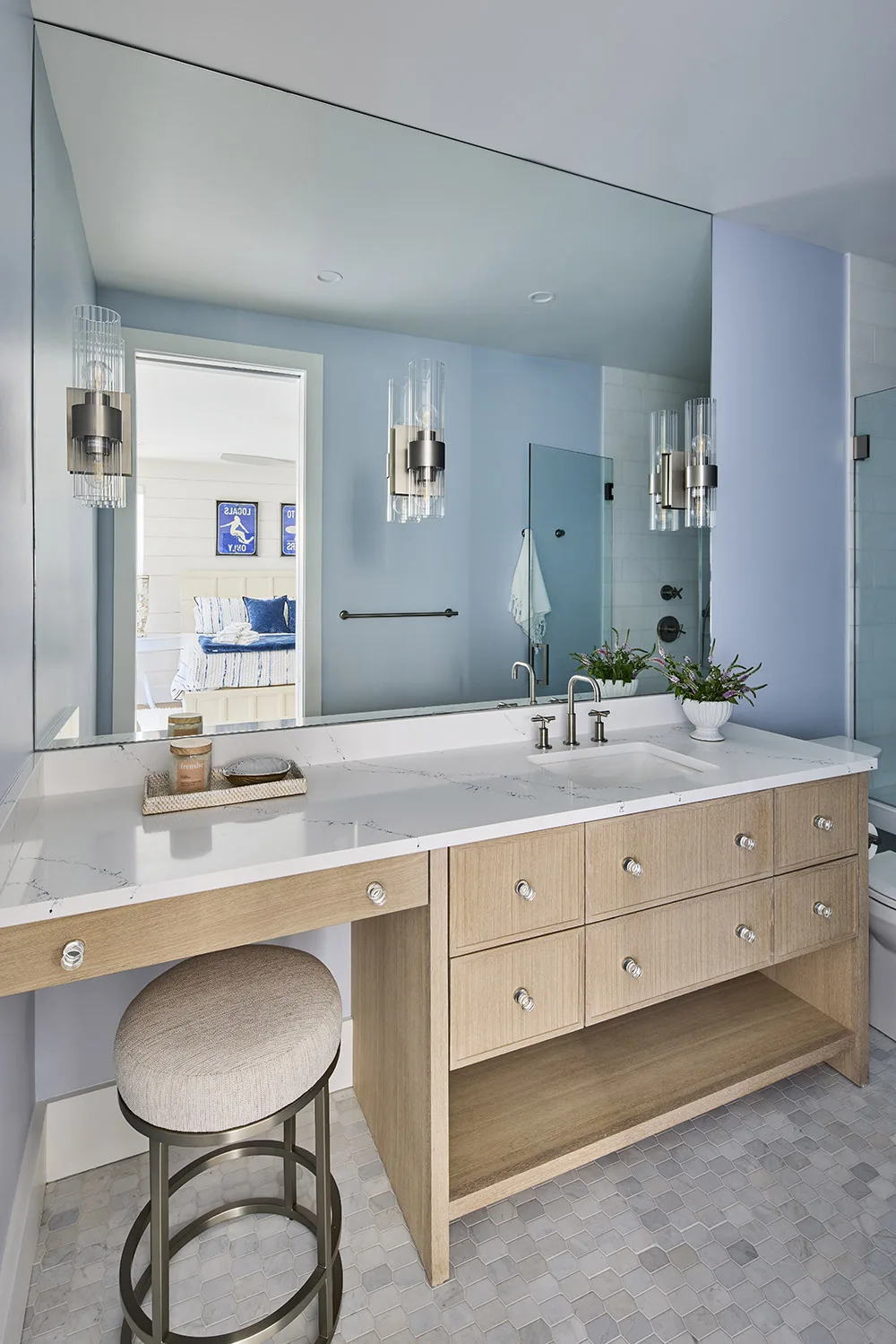 Consider adding medicine cabinets with interior outlets, drawer dividers for cosmetics, or hidden hampers built into cabinetry. These details keep surfaces clear and routines effortless.